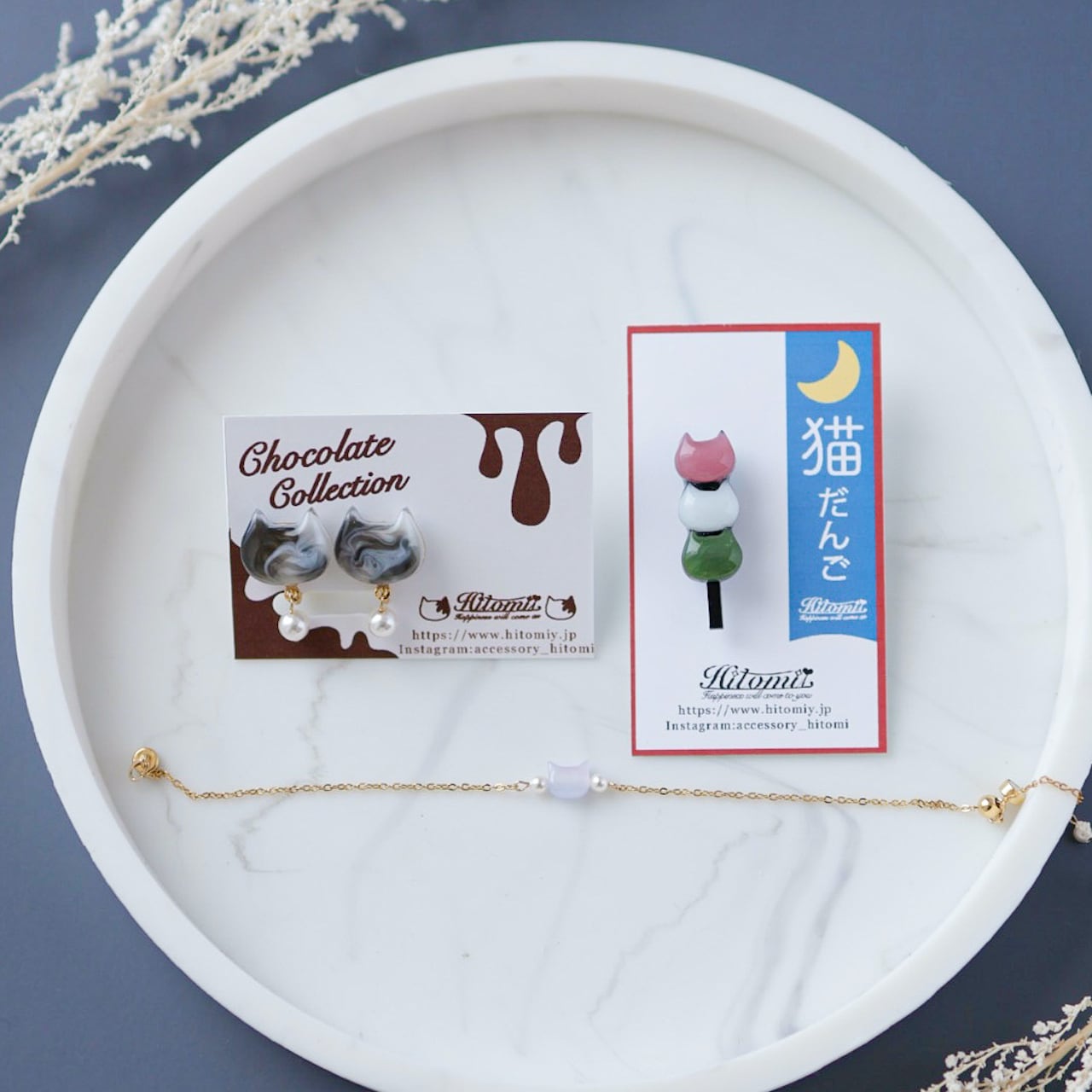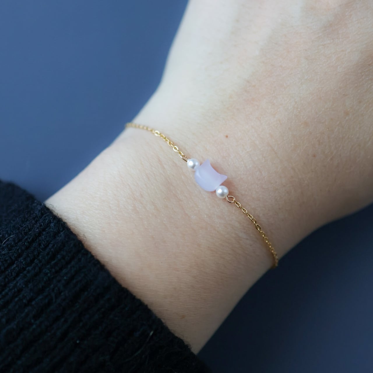つるんと色味が綺麗な猫とパールのシンプルブレスレットです。