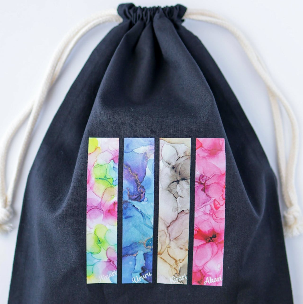 春夏秋冬のカラーを黒の大きい巾着にしました。旅行に何でも入れられるアイテムに!